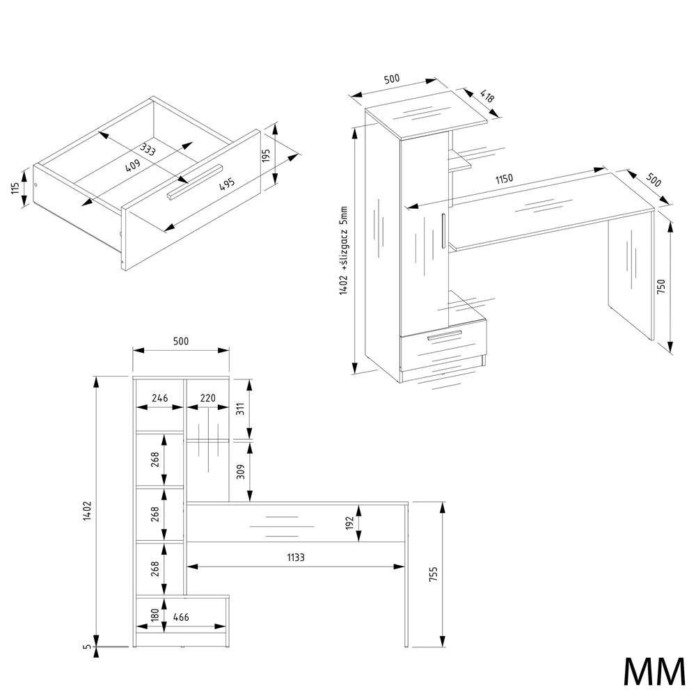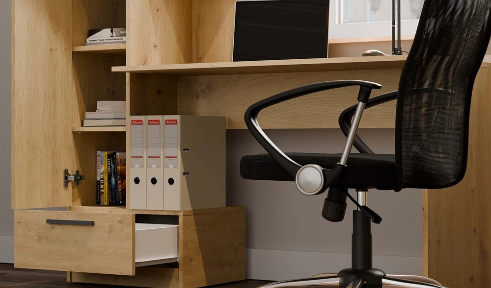 - Szeroki blat roboczy – komfortowa przestrzeń do pracy z laptopem lub notatkami