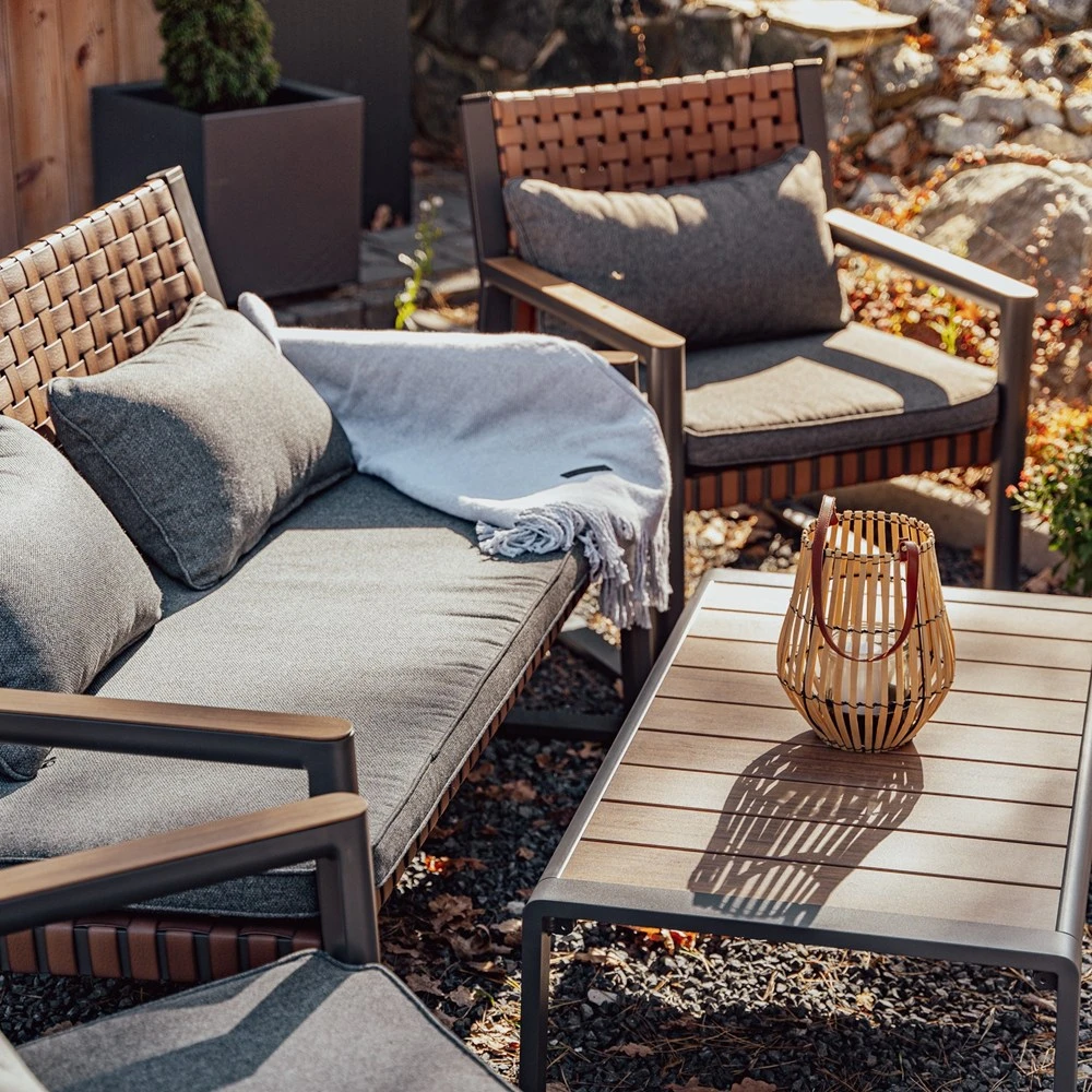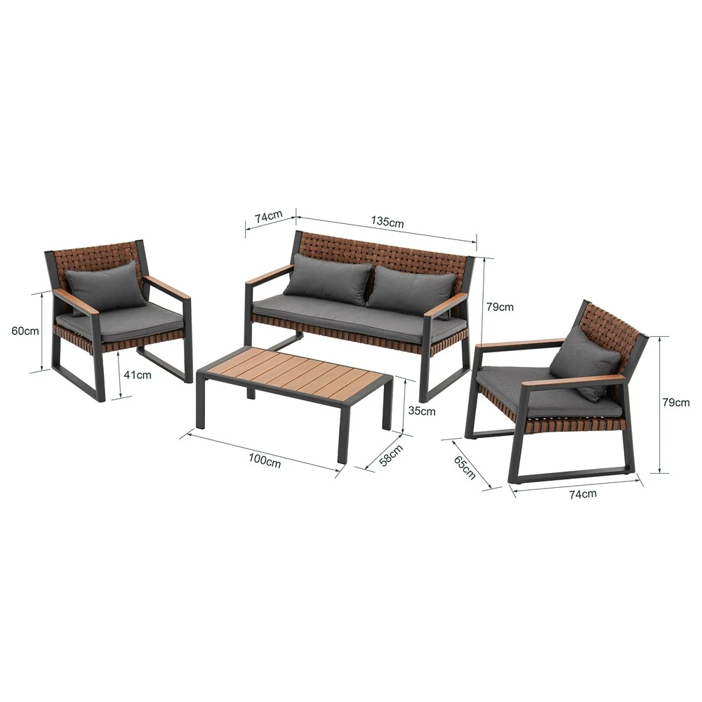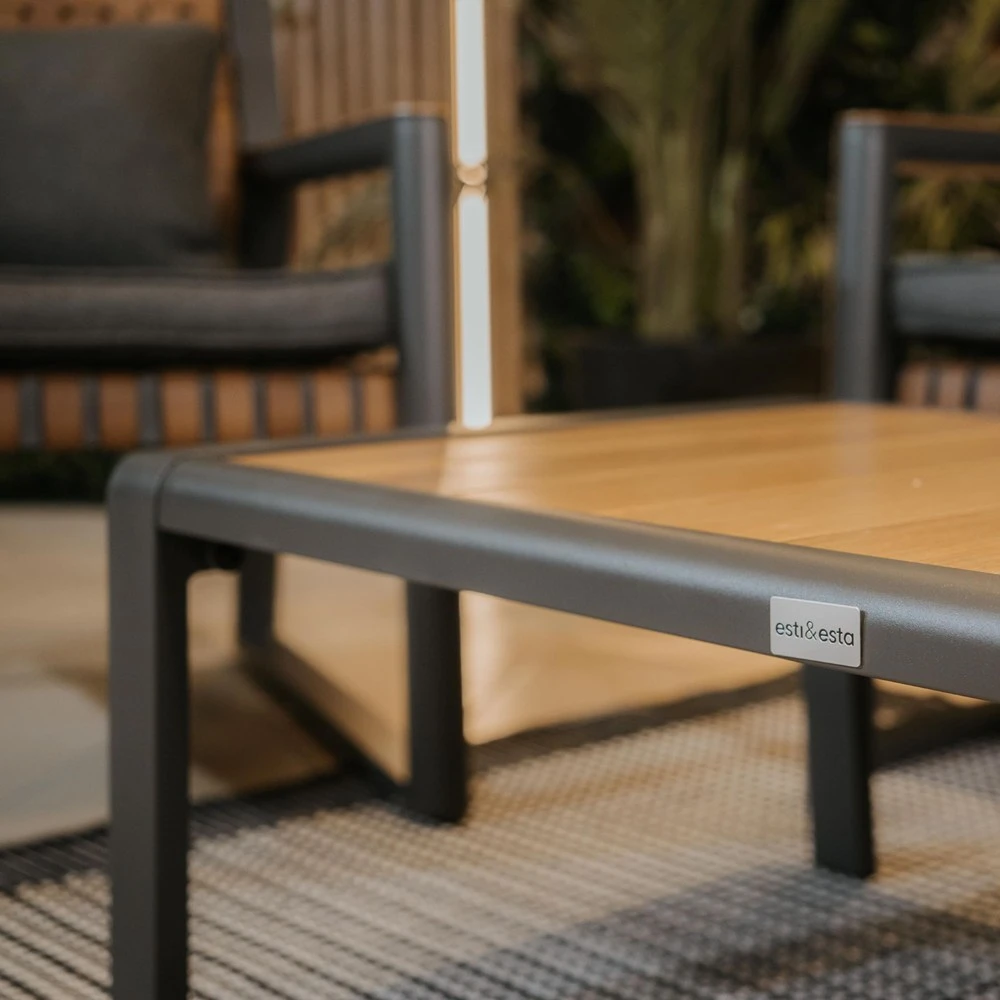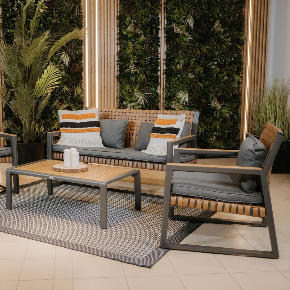 Całość utrzymana jest w eleganckim, stonowanym zestawie kolorystycznym: grafitowa konstrukcja + plecionka w odcieniu drewna + ciemnoszare poduszki.